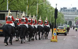 The soldiers head down The Mall, ready to change the guard at Horse Guards Parade