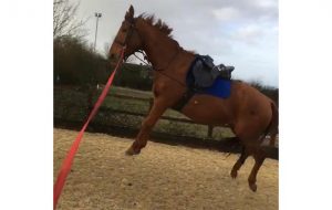 Cerys Sutton — “This is my chestnut thoroughbred mare being very fresh this morning!”