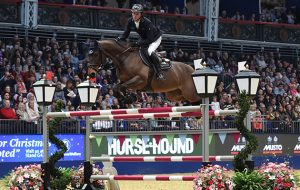 Getting in the Christmas spirit: Ben and Boomerang in the jump-off for the 2015 Santa Stakes at The London International Horse Show, Olympia