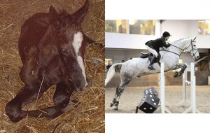 “This is my now 14-year-old Irish Sports Horse (more Irish than sports horse!), Brecks Jubilee. He was bay as a foal, pictured on the day he was born in 2002” — Kirsty Keeton