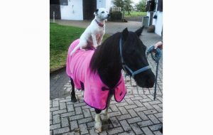 “Here is Lucy, a 10-year-old rescue Jack Russell, hitching a lift back from the wash bay to Shetland Pocket Rocket’s stable after having a bath before a showing show last year! They are best friends.” — Sarah Ferguson