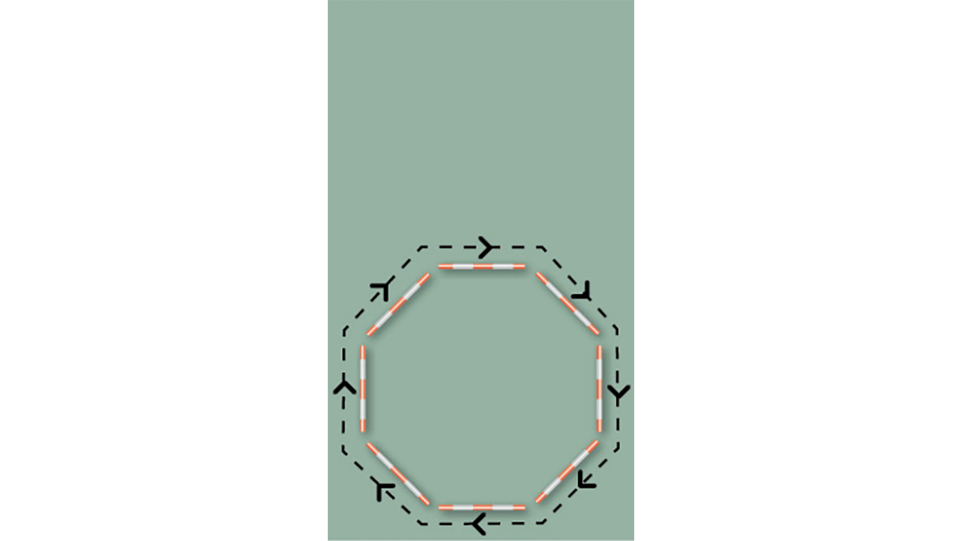 2. Build an octagonal shape with poles on the ground (see diagram, above), using almost the entire width of the arena (about 18 metres). Ride just outside the poles, making sure you are parallel to them — use eight poles in the beginning so you get the feeling of riding parallel between two reins at all times. Later, as you become more proficient, you can remove some or all of the poles.