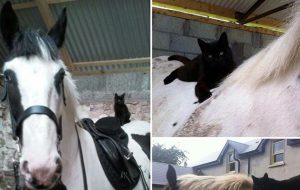 ‘Here is our cat Elmo who adores my horse Ernie. Since he was a kitten he has been making himself at home on Ernie’s back. It used to scare me at first in case he fell or freaked out Ernie. But he can jump from the stable wall onto Ernie’s hindquarters and Ernie doesn’t bat an eyelid.’ — Liz Fenton