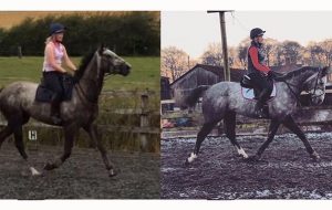 “This is Frosty The Snowman, a five-year-old 17hh ex-Flat racehorse. He won twice and was placed on a number of occasions. This is his transformation in four months since of coming off the track. I am retraining him to be an event horse with help from my university academy trainer Chris Bartle and we have been placed at every competition we’ve been to so far” — Olivia Proctor