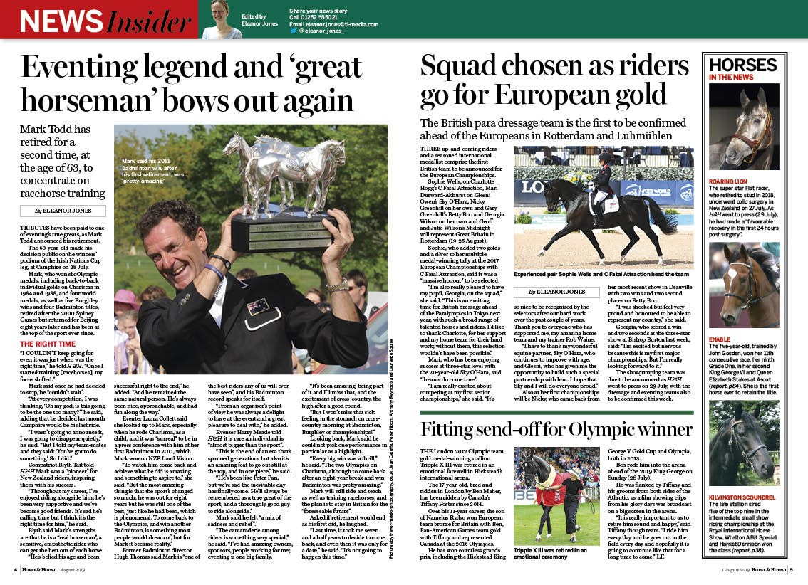 In this week’s Horse & Hound magazine, out on Thursday 1 August 2019, check out our full report from the Royal International Horse Show at Hickstead, including all the showing and showjumping action, plus expert comments and analysis. Also, read all about Mark Todd hanging up his eventing boots (again), and don’t miss this week’s ‘Vet clinic’ — what to expect from your ex-racehorse’s health and behaviour. We also investigate the risk of buying horses wrapped up in fraud, and read reports from across the disciplines, including eventing, racing, polo and more.