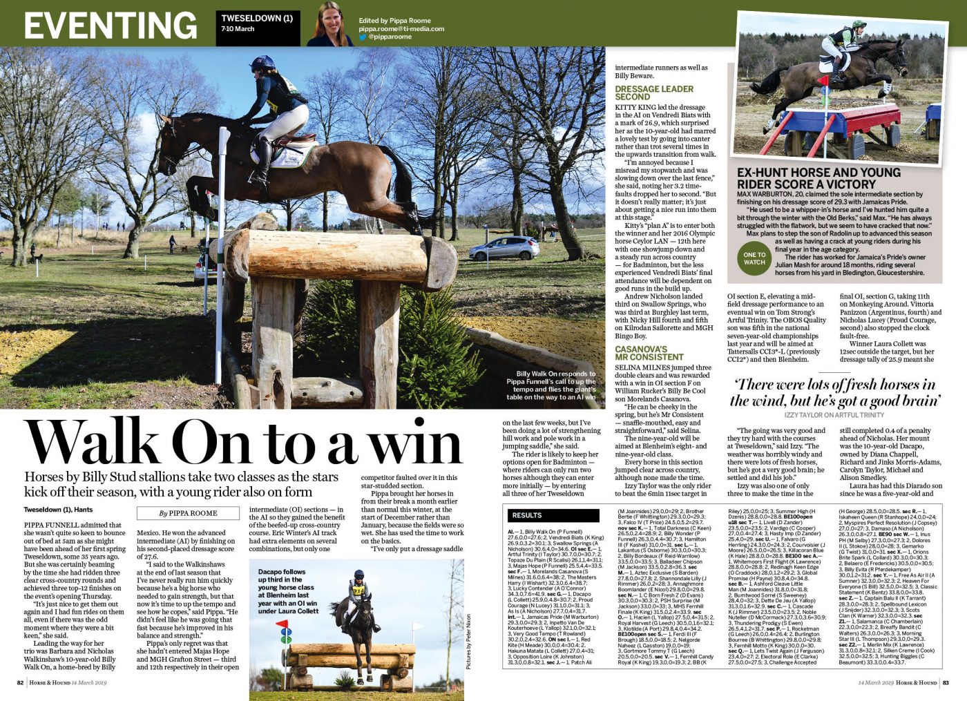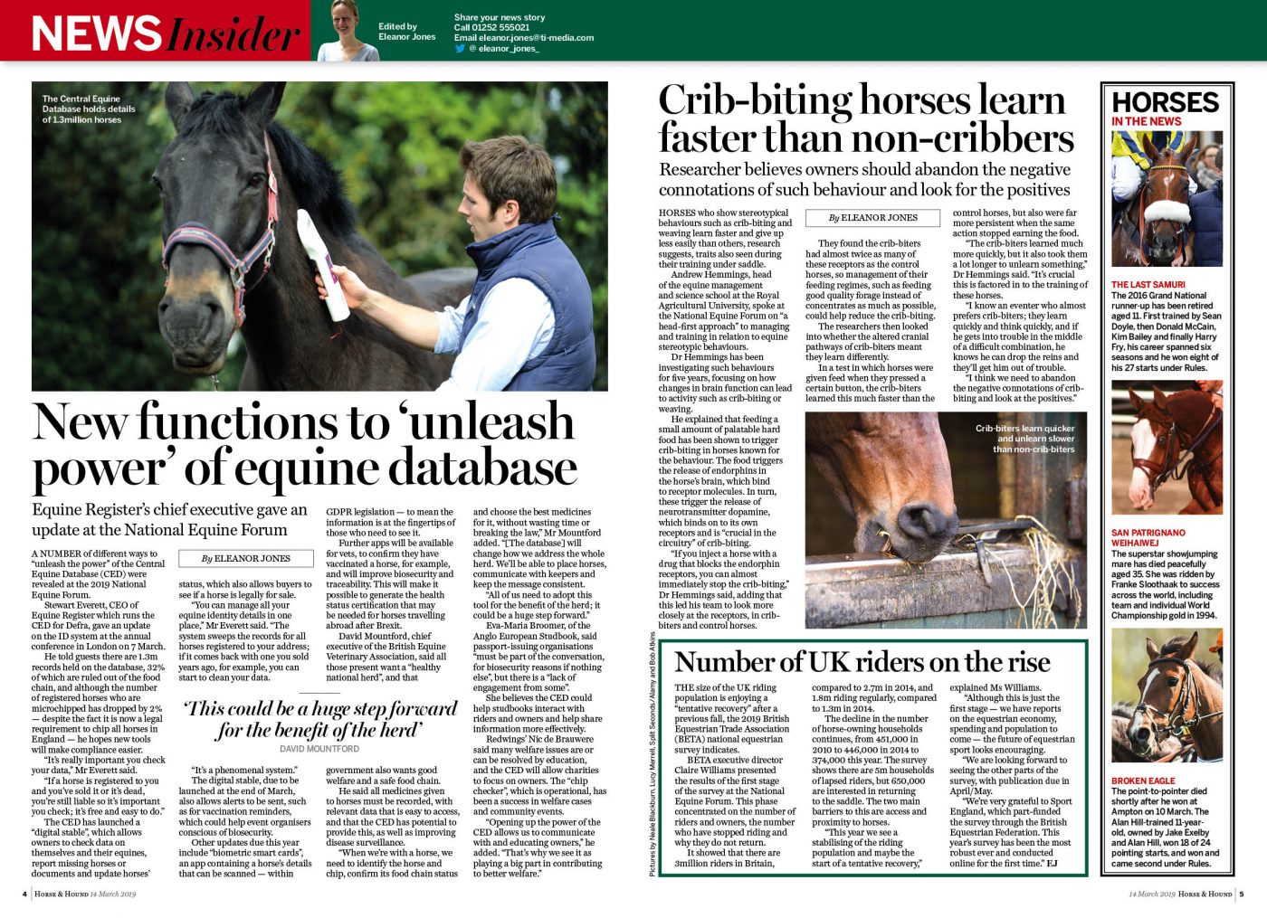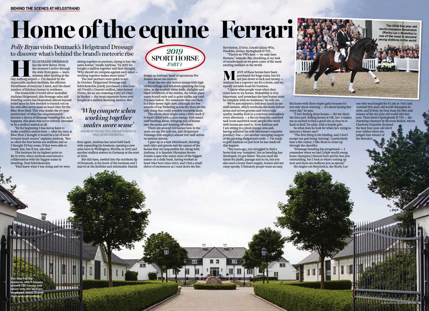 • In this week’s Horse & Hound magazine, out on Thursday 14 March 2019, don’t miss part one of our ‘Sport horse breeding’ special issue, including our feature on the Helgstrand Dressage empire, plus we look at the influential sires of 2019 and much more. Also check out our interview with champion National Hunt trainer Nicky Henderson. In this week’s ‘Vet clinic’ we take a look at vaccinations, and we find out more about the banana-loving dressage gelding, Hawtins Delicato. Enjoy our hunting content, including days out with the Morpeth and Hursley Hambledon and more, plus we have reports from across the disciplines including eventing, dressage, showjumping and much, much more.