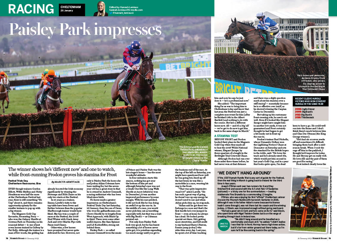 In this week’s Horse & Hound magazine, out on Thursday 31 January 2019, don’t miss our ‘Kit special’ including how to succeed in secondhand shopping, plus we take a look at therapy rugs, sheepskin saddle pads and more. Also, we visit illustrious couple William and Pippa Funnell at home, and in this week’s H&H interview we talk to Paul Nicholls’ number one jockey Harry Cobden. In ‘Vet clinic’ we look into how technology is helping surgeons, plus read reports from across the country including hunting action, racing from Cheltenham and much more.