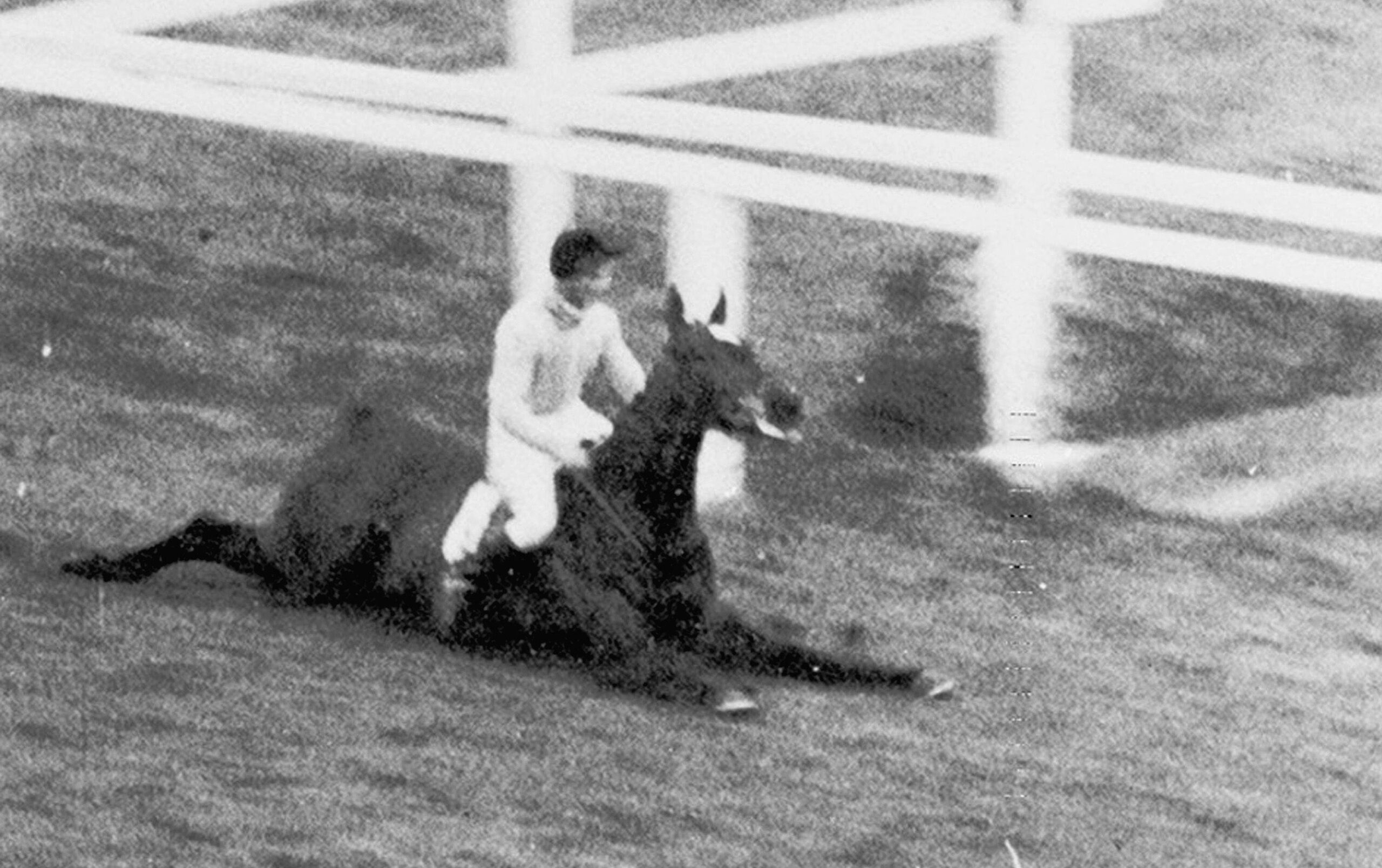 Dick Francis and Devon Loch both walk away from the fall. Credit: Alamy