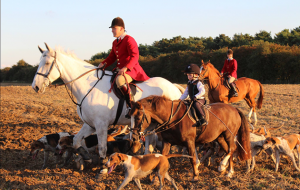 Lee Roberts’ four-year-old son is out for the first time on his pony Drummer, riding with huntsman George Whittaker and whipper-in Kate Pegrum